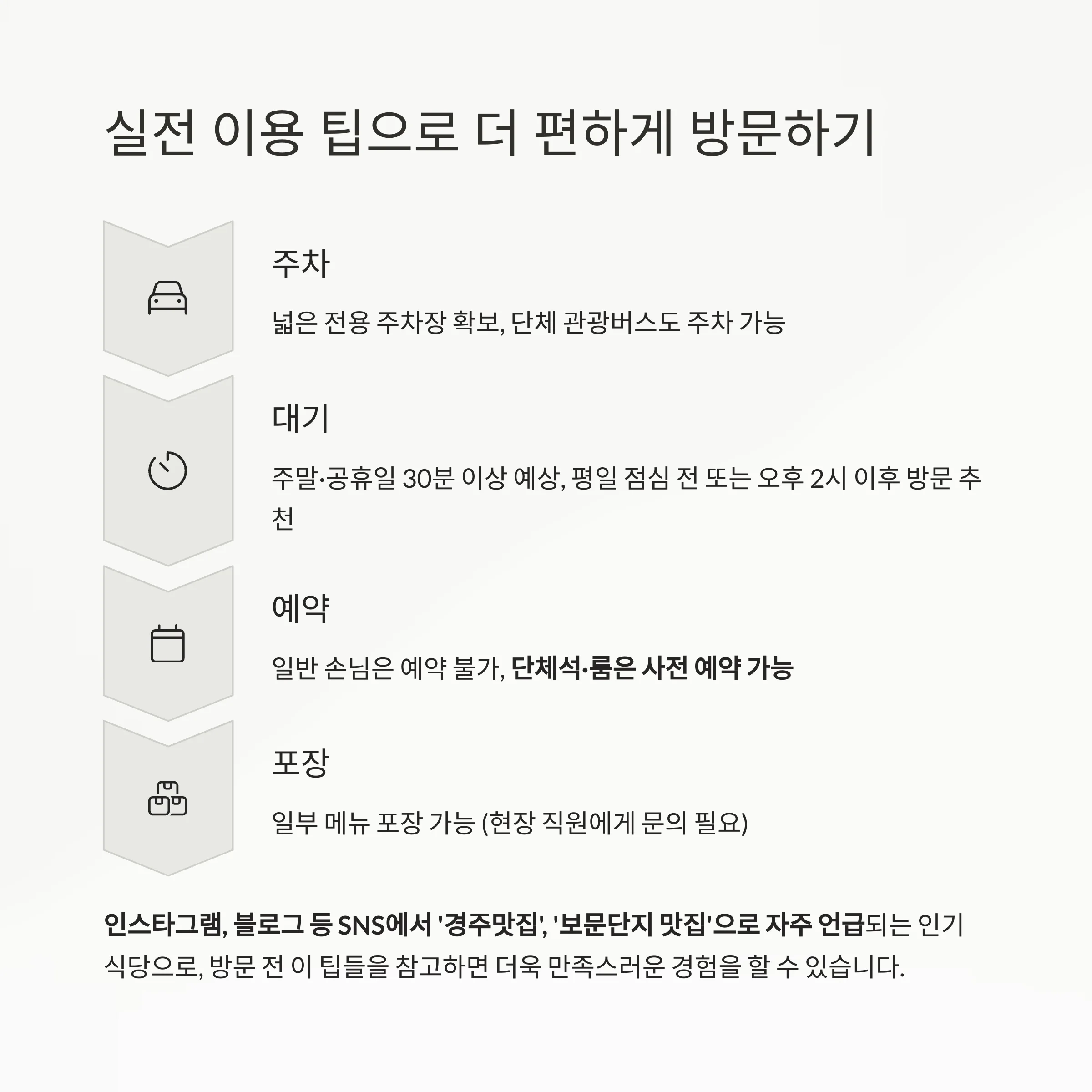 • 주차: 넓은 전용 주차장 확보, 단체 관광버스도 주차 가능