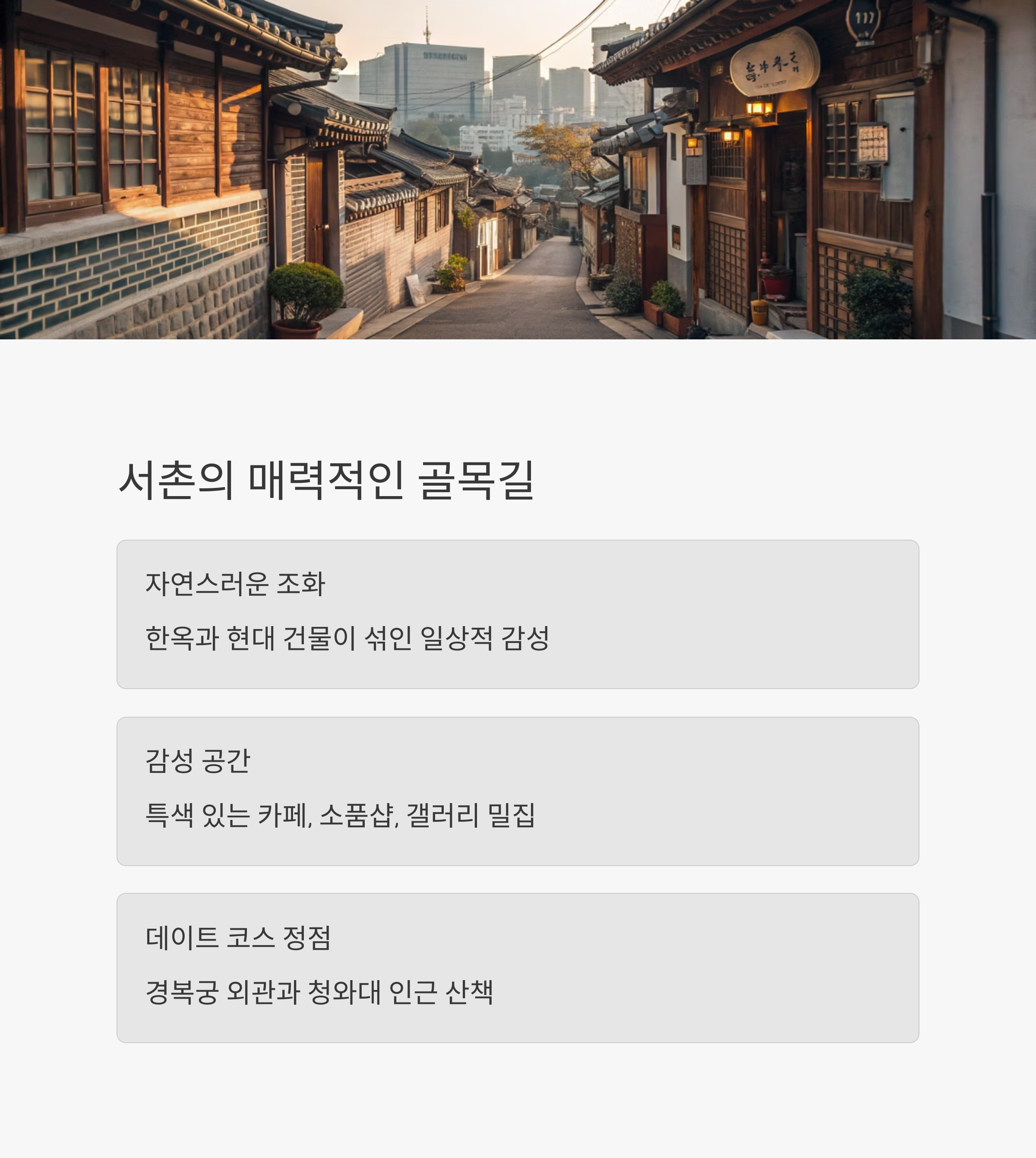 한옥과 현대 건물이 자연스럽게 섞여 있는 일상적 감성이 매력적입니다.