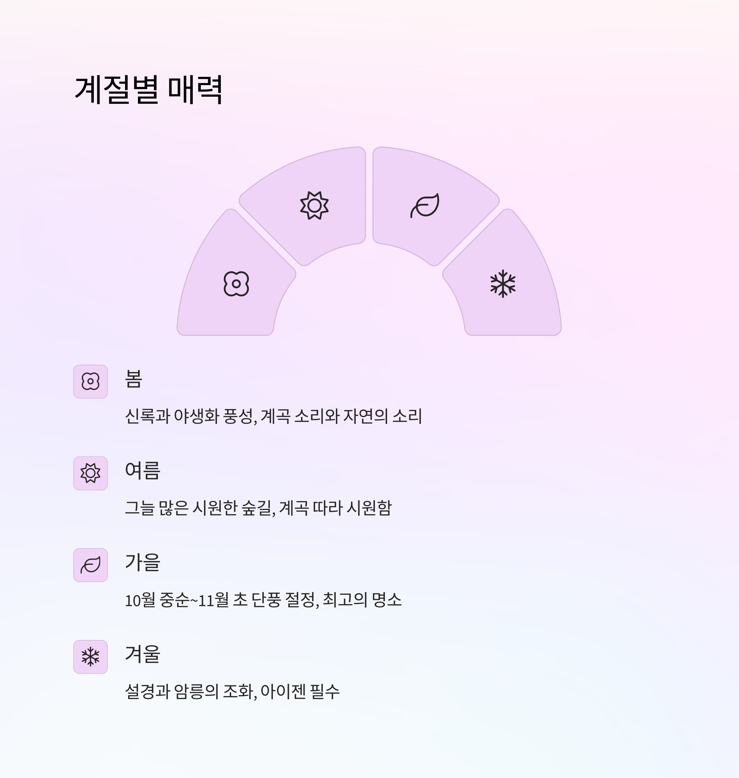 사계절 내내 매력이 다르니, 시즌별로 재방문 가치도 충분합니다.