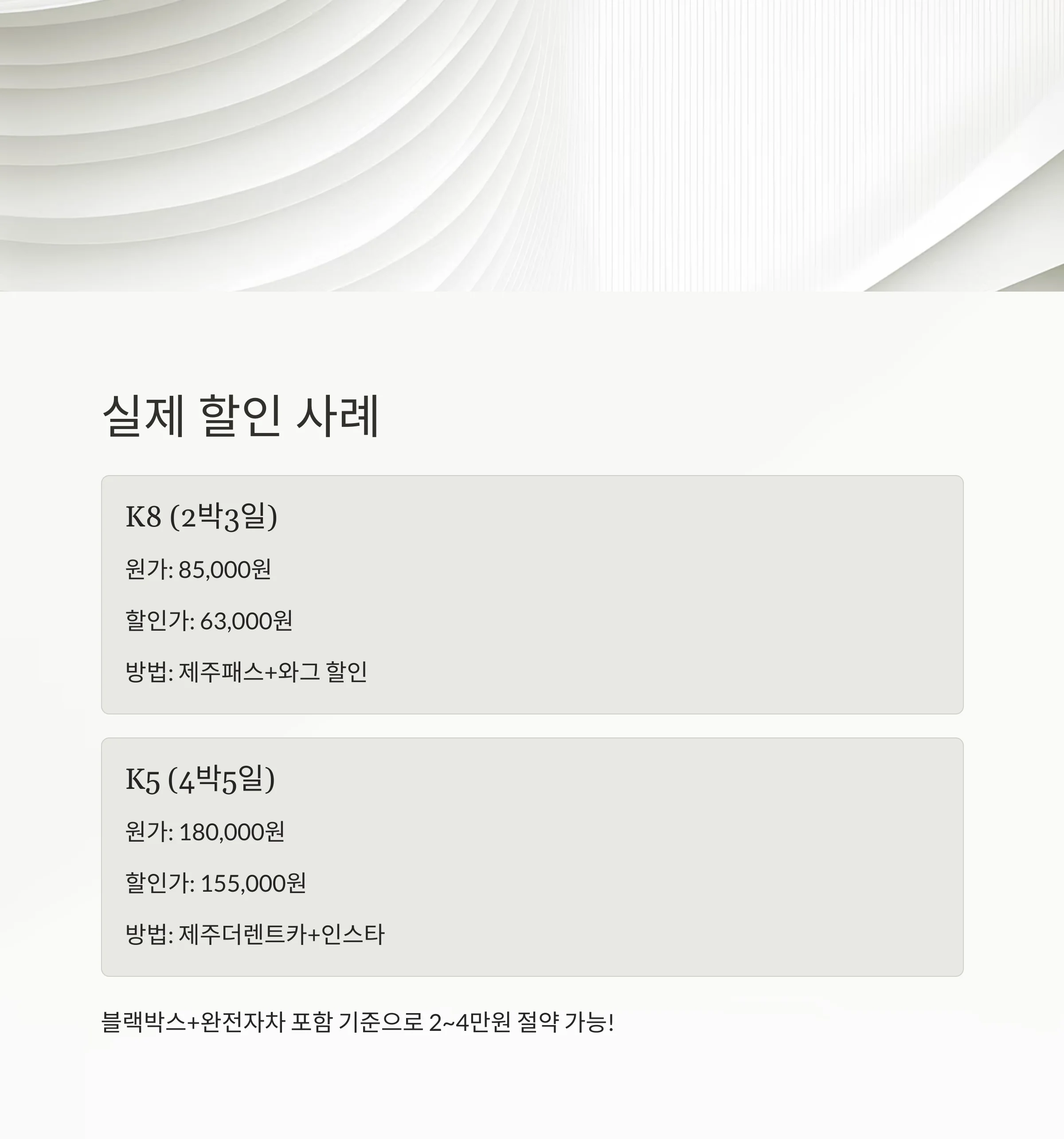 | K5 (4박5일) | 약 180,000원 | 155,000원 | 제주더렌트카 + 인스타 할인 |