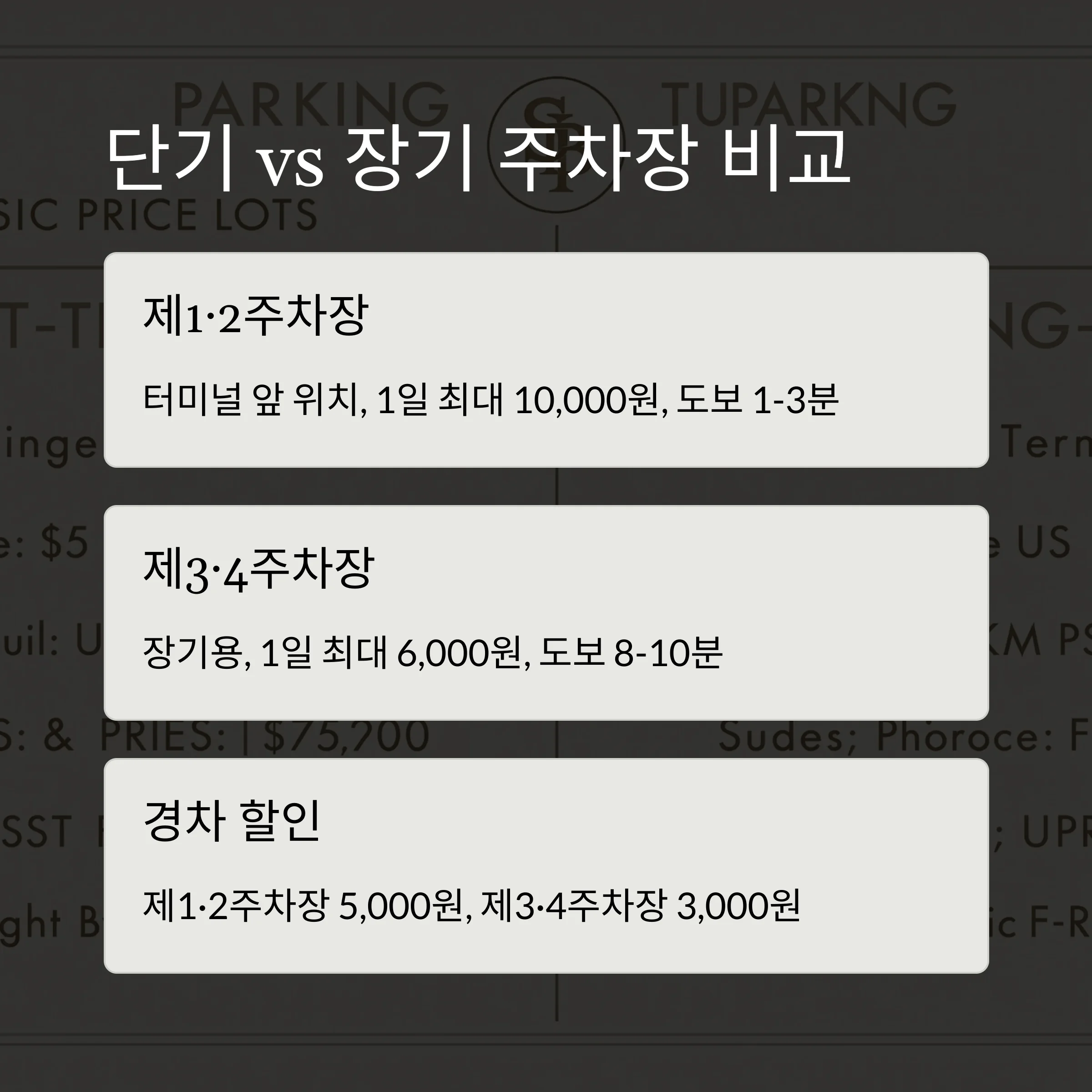 | 항목 | 제1·2주차장 (터미널 앞) | 제3·4주차장 (장기용) |